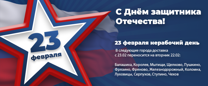 22 февраля сокращенный рабочий день, доставка по графику вторника и среды, с графиком доставки можно ознакомиться по ссылке.